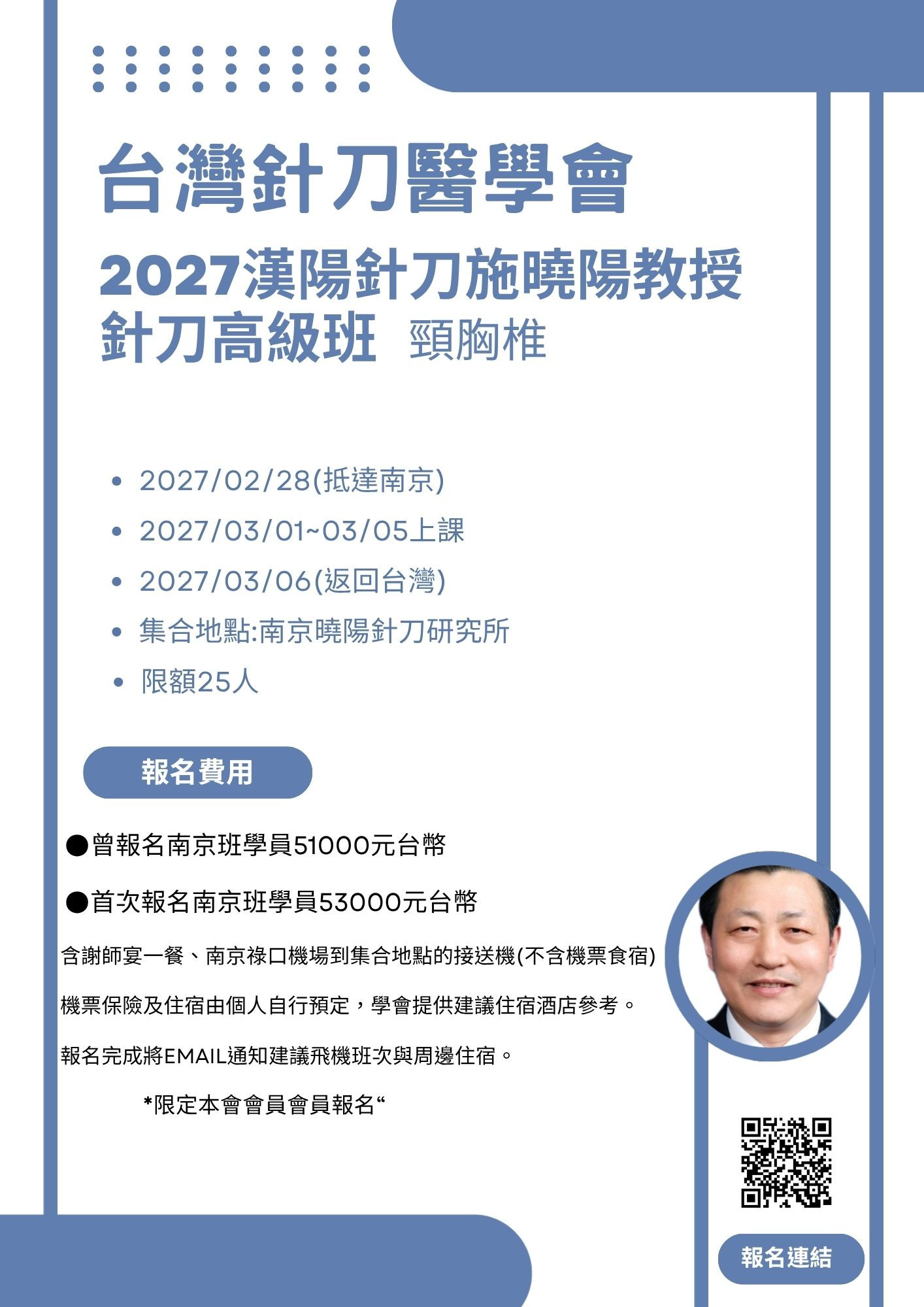 Course Information / 課程資訊 首頁 課程資訊 2027漢陽針刀施曉陽教授 針刀高級班-頸胸椎 報名課程 2027漢陽針刀施曉陽教授 針刀高級班-頸胸椎 2027/02/28抵達南京 2027/03/01~03/05上課 2027/03/06返回台灣 *曾報名南京班學員51000元 *首次報名南京班學員53000元 (不含機票食宿) *限本會會員參加* 簡章下載 截止日期:2027-03-06 報名 種類 日期 時間 主題 講師 地點 學分 一般 2027-03-01 2027漢陽針刀施曉陽教授 針刀高級班 南京 30學分 填寫報名資料 *姓名 *手機 *午餐 葷 素 *會員別 非會員 一般會員 永久會員 *服務院所 *通訊地址 *Email 匯款證明 確認送出